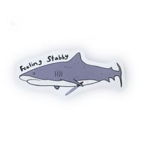 digital illustration of a shark with a dagger and the words “feeling stabby”’in bold black letters